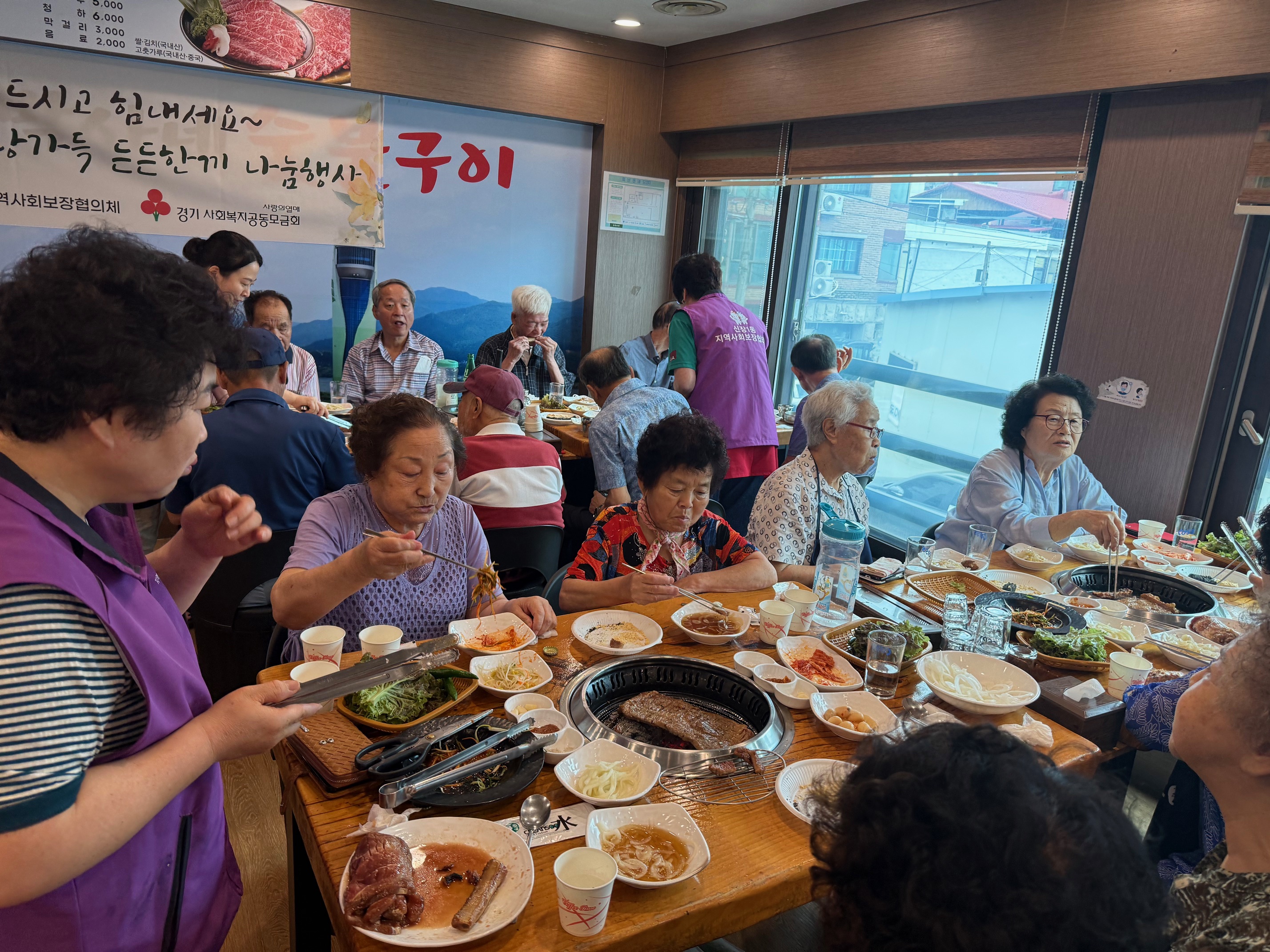 하남시 신장1동 지역사회보장협의체(위원장 박명자)는 2025.7.18.(금), 초복을 맞아 관내 취약계층 어르신 40명을 모시고 관내 식당에서 돼지갈비 구이와 떡, 제철 과일로 구성된 점심 식사를 대접했다.