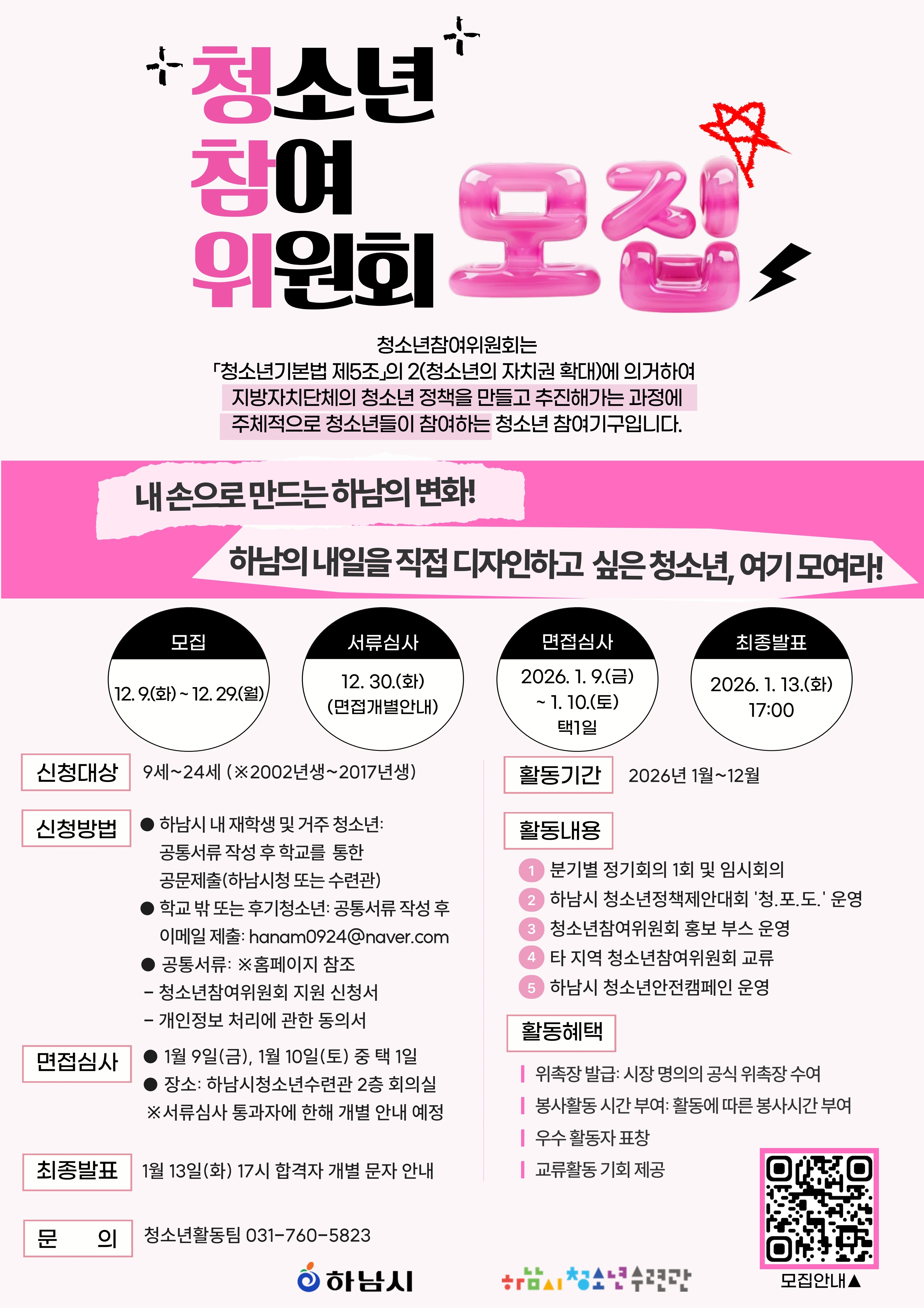지역사회 정책에 청소년들이 주체적으로 참여할 수 있도록 운영하는 하남시 청소년참여위원회의 제24기 위원을 모집합니다.