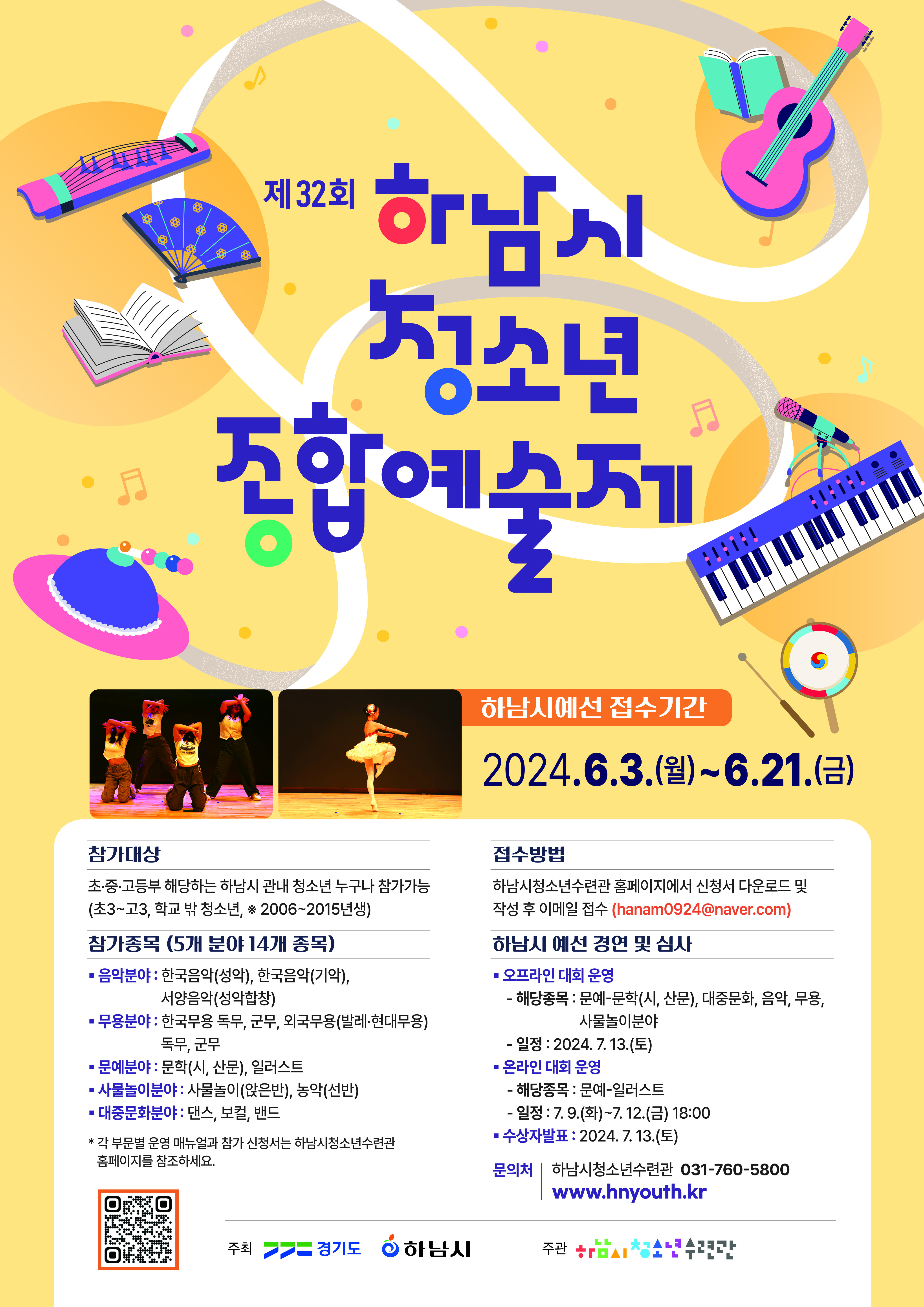 - 음악, 무용, 사물놀이, 대중문화 : 2024. 7. 13.(토) 13:00~18:00, 하남시청소년수련관