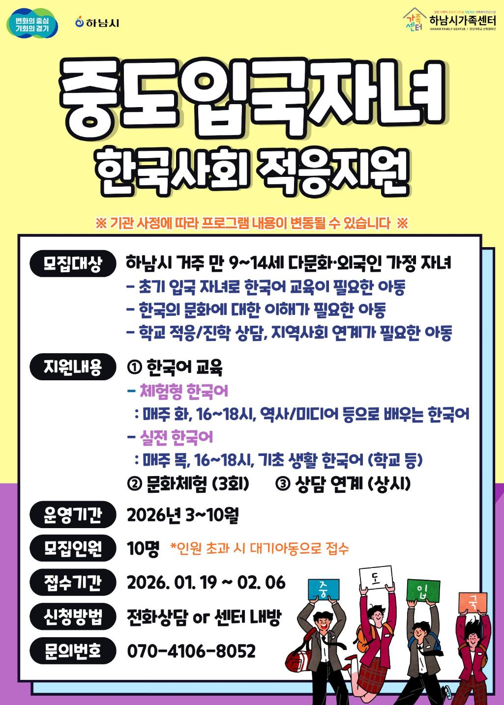 ○ 모집대상: 하남시 거주 만 9~14세 다문화·외국인 가정 자녀