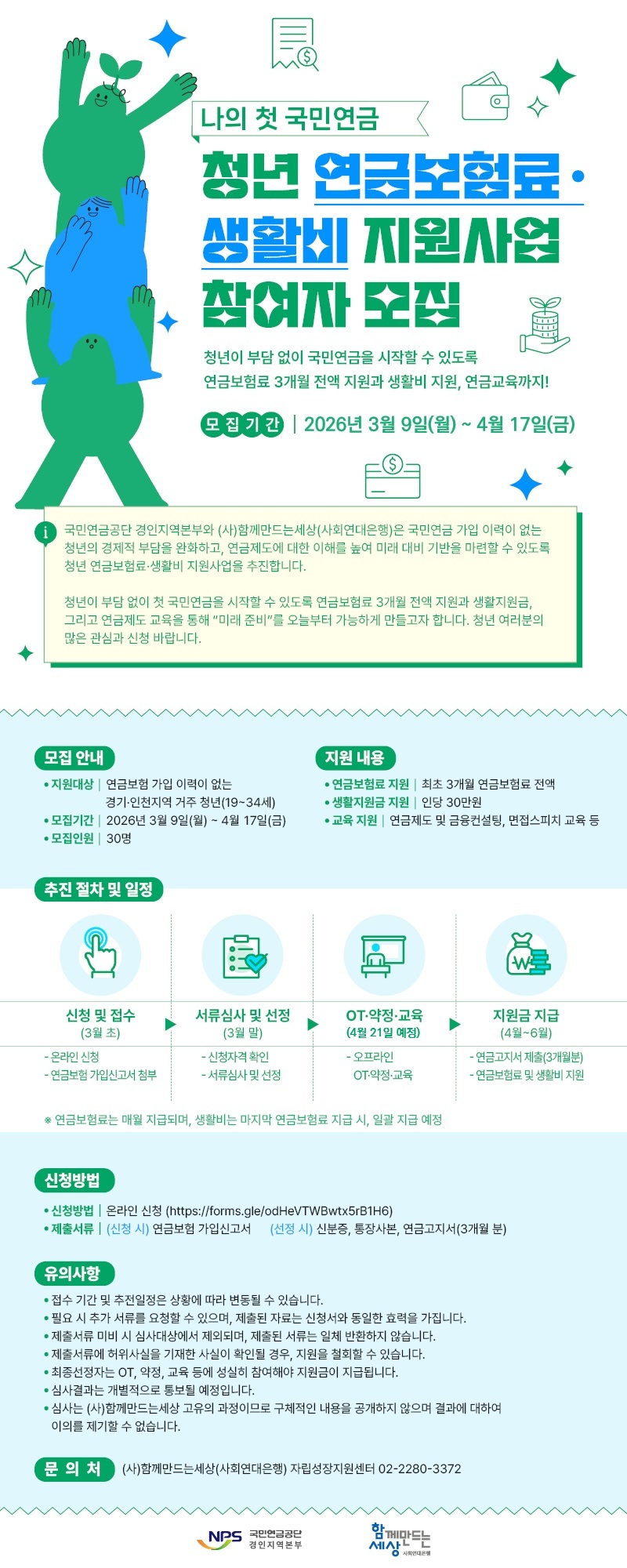 - 지원대상 : 국민연금 가입 이력이 없는 경기, 인천 지역 거주 청년 30명(19~34세)